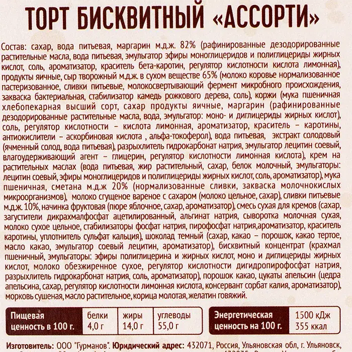 "Торт бисквитный «Прага» Состав: сахар, вода питьевая, маргарин м.д.ж. 82% (рафинированные дезодорированные растительные масла, вода питьевая, эмульгатор эфиры моноглицеридов и полиглицериды жирных кислот, соль, ароматизатор, краситель бета-каротин, регулятор кислотности кислота лимонная), продукты яичные, начинка фруктовая (пюре яблочное, сахар, ароматизатор), мука пшеничная, шоколад темный (сахар, какао – порошок, какао тертое, масло какао, эмульгатор соевый лецитин, ароматизатор), бисквитный концентрат (крахмал пшеничный, эмульгаторы: эфиры полиглицерина и жирных кислот, моно и диглицериды жирных кислот, молоко обезжиренное сухое, регулятор кислотности дигидропирофосфат натрия, разрыхлитель гидрокарбонат натрия, соль, ароматизатор), сливки питьевые м.д.ж. 10%, смесь сухая для кремов (сахар, загустители дикрахмалфосфат ацетилированный, альгинат натрия, сыворотка молочная сухая, молоко сухое цельное, стабилизаторы фосфат натрия, пирофосфат натрия,ароматизатор, краситель каротины, уплотнитель сульфат кальция), масло растительное Пищевая ценность 100 г: белки – 3,0 г, жиры – 14,0 г, углеводы – 40,0 г. Энергетическая ценность 100 г: 1240 кДж/295 ккал. Торт заварной ""Медовик"" Состав: мука пшеничная, сметана м.д.ж 20% (нормализованные сливки, закваска молочнокислых микроорганизмов), молоко сгущеное вареное с сахаром (молоко цельное, сахар), крем на растительных маслах (вода питьевая, жир растительный, сахар, белок молочный, эмульгаторы: сорбитовый сироп, лецитин соевый, эфиры моноглицеридов и полиглицериды жирных кислот, соль, ароматизатор), сахар, продукты яичные, маргарин м.д.ж. 82% (рафинированные дезодорированные растительные масла, вода питьевая, эмульгатор эфиры моноглицеридов и полиглицериды жирных кислот, соль, ароматизатор, краситель бета-каротин, регулятор кислотности кислота лимонная), вода питьевая, экстракт солодовый (ячменный солод, вода), патока, мёд, разрыхлитель гидрокарбонат натрия, эмульгатор – лецитин соевый, агент влагоудерживающий глицерин, регулятор кислотности лимонная кислота Пищевая ценность 100 г: белки – 6,0 г, жиры – 13,5,0 г, углеводы – 45 г. Энергетическая ценность 100 г: 1390 кДж/330 ккал. Торт бисквитный «Красный бархат» Состав: сыр творожный м.д.ж. в сухом веществе 65% (молоко коровье нормализованное пастеризованное, сливки питьевые, молокосвертывающий фермент микробного происхождения, закваска бактериальная, стабилизатор камедь рожкового дерева, соль), сахар, продукты яичные, крем на растительных маслах (вода питьевая, жир растительный, сахар, белок молочный, эмульгаторы: сорбитовый сироп, лецитин соевый, эфиры моноглицеридов и полиглицериды жирных кислот, соль, ароматизатор), мука пшеничная, вода питьевая, маргарин м.д.ж. 82% (рафинированные дезодорированные растительные масла, вода питьевая, эмульгатор эфиры моноглицеридов и полиглицериды жирных кислот, соль, ароматизатор, краситель бета-каротин, регулятор кислотности кислота лимонная), какао – порошок, сливки питьевые м.ж.д 10%, крахмал пшеничный, крахмал картофельный, декстроза, разрыхлители пирофосфат натрия, гидрокарбонат натрия; загустители ксантановая камедь, альгинат натрия; молоко сухое цельное, эмульгатор моноглицериды жирных кислот, соль, регулятор кислотности кислота лимонная, ароматизатор, консервант сорбат калия, сыворотка молочная сухая, краситель Понсо 4R. 