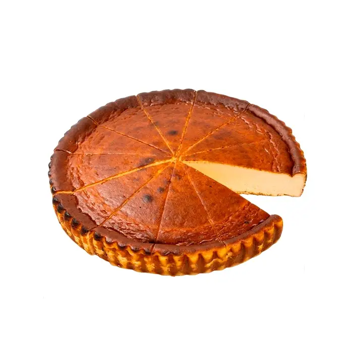 Баскский чизкейк с нежной текстурой, кремовым вкусом с нотками карамели и ванили и темной корочкой, которая создается после запекания при высокой температуре. Чизкейк без коржа внутри остается мягким и сладковатым, что контрастирует со слегка горьковатой корочкой.