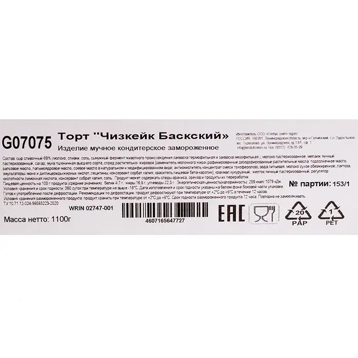 Торт чизкейк Баскский «Кристоф», 12 порций, 1,1 кг