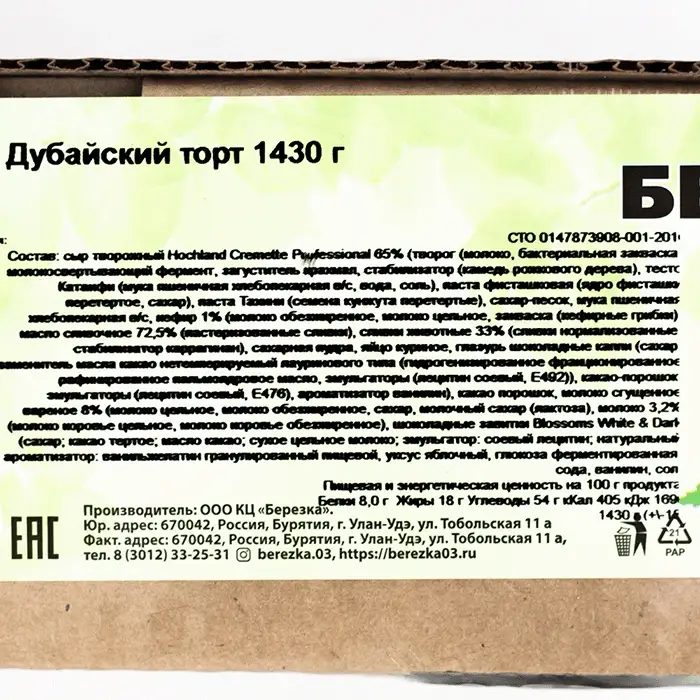Торт Дубайский «Березка», 12 порций, 1,47 кг