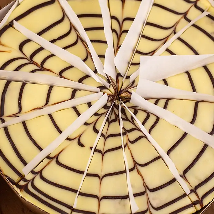 Классический торт из воздушных слоев ванильно-орехового бисквита с нежным ванильно-сливочным кремом посыпан дробленым орехом. Сверху украшен сахарной помадкой и мраморным рисунком.