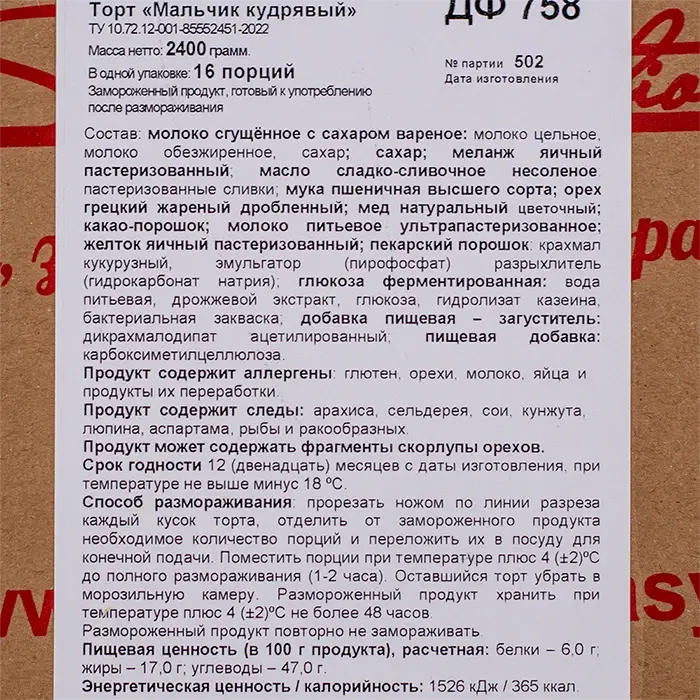 молоко сгущённое с сахаром вареное: молоко цельное, молоко обезжиренное, сахар; сахар; меланж яичный пастеризованный; масло сладко-сливочное несоленое: пастеризованные сливки; мука пшеничная высшего сорта; орех грецкий жареный дробленный; мед натуральный цветочный; какао-порошок; молоко питьевое ультрапастеризованное; желток яичный пастеризованный; пекарский порошок: крахмал кукурузный, эмульгатор (пирофосфат) разрыхлитель (гидрокарбонат натрия); глюкоза ферментированная: вода питьевая, дрожжевой экстракт, глюкоза, гидролизат казеина, бактериальная закваска; добавка пищевая – загуститель: дикрахмалодипат ацетилированный; пищевая добавка: карбоксиметилцеллюлоза.