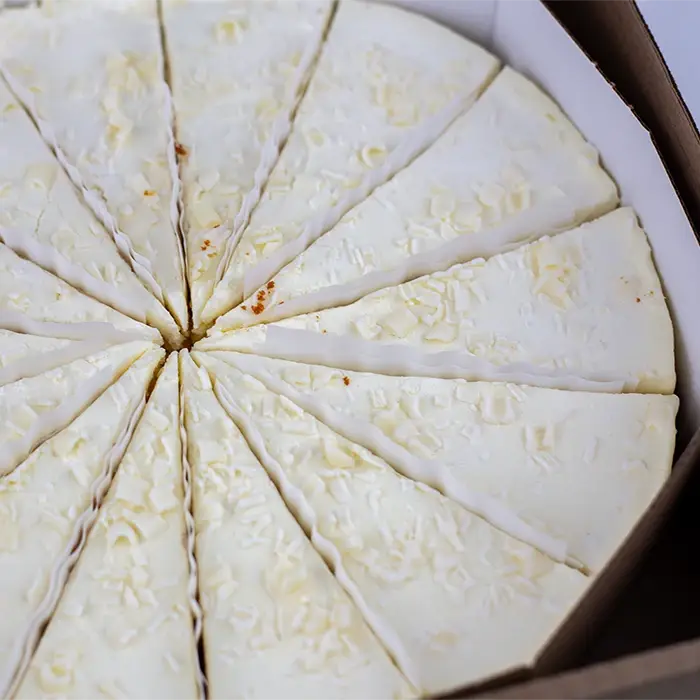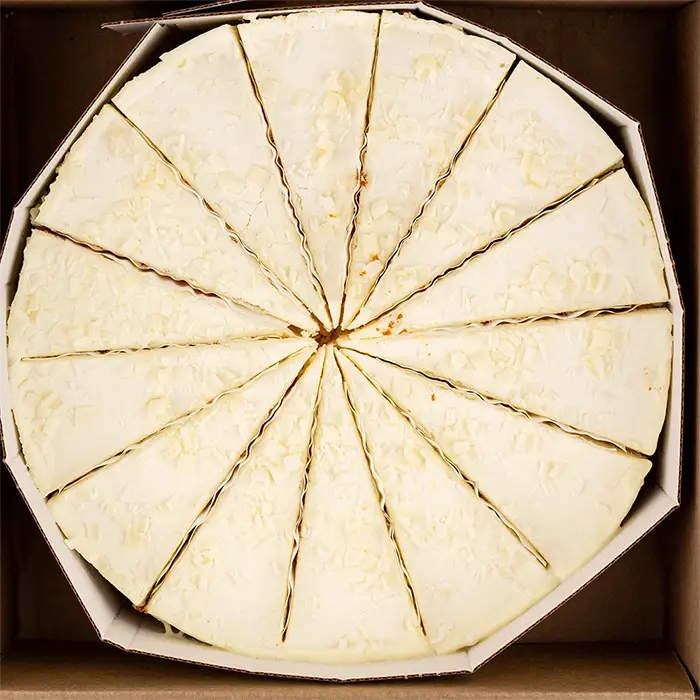 Торт «Молочная девочка» многослойный из тонких, нежных бисквитных коржей на основе сгущенного молока, пропитанных воздушным творожно-сливочным кремом. Торт посыпан белой шоколадной стружкой.