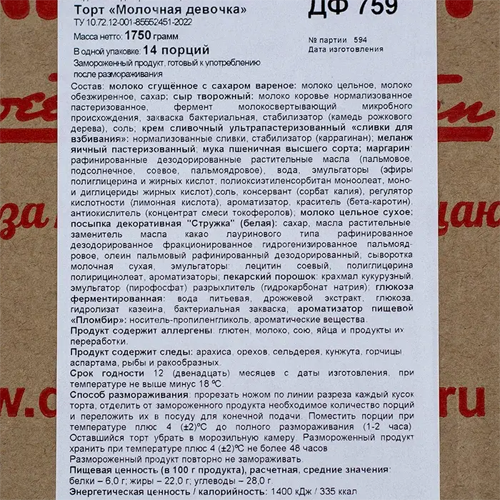 молоко сгущённое с сахаром вареное: молоко цельное, молоко обезжиренное, сахар; сыр творожный: молоко коровье нормализованное пастеризованное, фермент молокосвертывающий микробного происхождения, закваска бактериальная, стабилизатор (камедь рожкового дерева), соль; крем сливочный ультрапастеризованный «сливки для взбивания»: нормализованные сливки, стабилизатор (каррагинан); меланж яичный пастеризованный; мука пшеничная высшего сорта; маргарин: рафинированные дезодорированные растительные масла (пальмовое, подсолнечное, соевое, пальмоядровое), вода, эмульгаторы (эфиры полиглицерина и жирных кислот, полиоксиэтиленсорбитан моноолеат, моно-и диглицериды жирных кислот),соль, консервант (сорбат калия), регулятор кислотности (лимонная кислота), ароматизатор, краситель (бета-каротин), антиокислитель (концентрат смеси токоферолов); молоко цельное сухое; посыпка декоративная "Стружка" (белая): сахар, масла растительные: заменитель масла какао лауринового типа рафинированное дезодорированное фракционированное гидрогенизированное пальмояд-ровое, олеин пальмовый рафинированный дезодорированный; сыворотка молочная сухая, эмульгаторы: лецитин соевый, полиглицерина полирицинолеат, ароматизаторы; пекарский порошок: крахмал кукурузный, эмульгатор (пирофосфат) разрыхлитель (гидрокарбонат натрия); глюкоза ферментированная: вода питьевая, дрожжевой экстракт, глюкоза, гидролизат казеина, бактериальная закваска; ароматизатор пищевой «Пломбир»: носитель-пропиленгликоль, ароматические вещества.