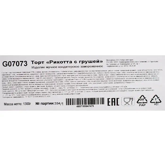 Груша в сиропе, сыр творожный CREAM CHEESE 65% (сливки нормализованные, молоко обезжиренное, соль, загустители: каррагинан, камедь рожкового дерева, камедь гуаровая; агент желирующий хлорид калия, закваска молочнокислых мезофильно-термофильных культур), сыр мягкий "Рикотта" (сыворотка подсырная, сливки пастеризованные, регулятор кислотности лимонная кислота) сахар, мука пшеничная в/с, вода питьевая, миндаль слайсы, меланж яичный пастеризованный, масло ши, молоко пастеризованное, рапсовое масло, сироп глюкозы, подсолнечное масло, крахмал кукурузный, рисовая мука, молоко сухое цельное, соевая мука, желток яичный пастеризованный, соль, разрыхлители: гидрокарбонат натрия, дигидропирофосфат натрия; желатин, белок яичный сухой, консервант сорбат калия, загуститель пектин, регулятор кислотности: цитрат калия, лимонная кислота; краситель бета-каротин.