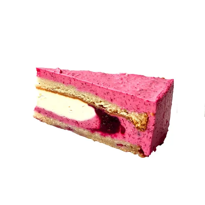 Торт с мягким сливочным кремом между двумя воздушными ванильными бисквитами, с черничным конфитюром и муссовым слоем с брусникой. Неприторный десерт имеет сладкий приятный вкус с ягодной кислинкой. Глубокая заморозка сохраняет вкус и свежесть десерта. Торт нарезан на порции, выглядит эстетично, его удобно использовать.
