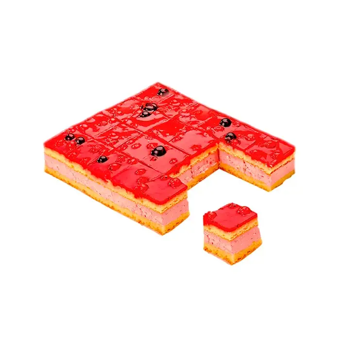 Десерт состоит из малинового крема и бисквита, который пропитан фруктовым сиропом, декорирован глянцевым фруктовым гелем и ягодами. Торт поделен на порции, имеет насыщенный ягодный вкус.