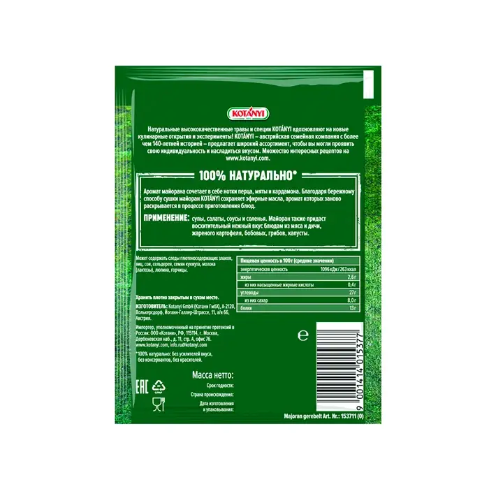 Майоран. Может содержать следы глютеносодержащих злаков, яиц, сои, сельдерея, семян кунжута, молока (лактозы), люпина, горчицы.