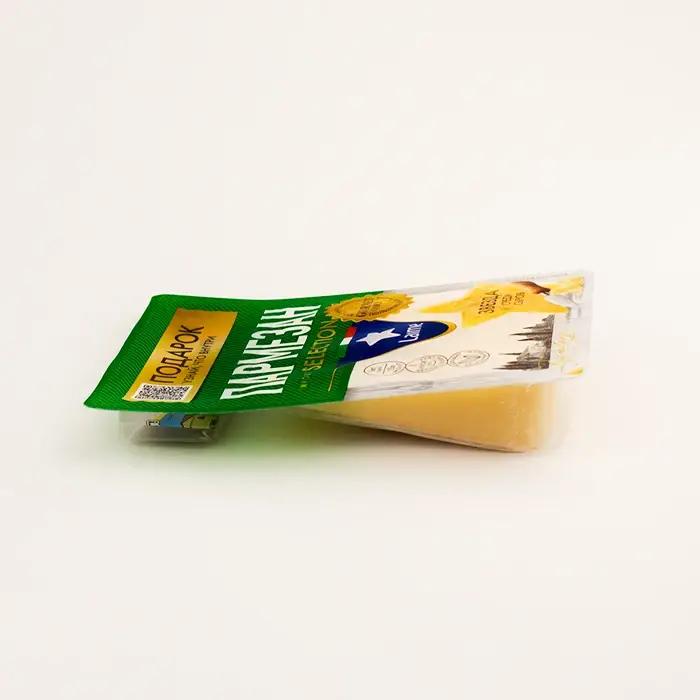 Пармезан — классический твердый сыр, произведенный в России по мотивам итальянского традиционного рецепта. Сыр имеет твердую плотную консистенцию, бледно–желтый цвет, крошащуюся, ломкую структуру, соленый вкус с ореховыми нотами с пикантным послевкусием.