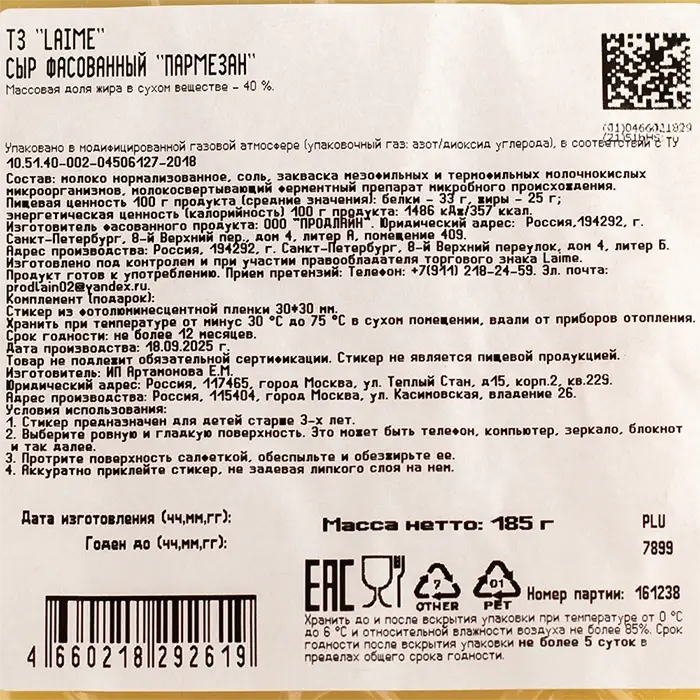Сыр твердый Пармезан 40% Laime, 185 г
