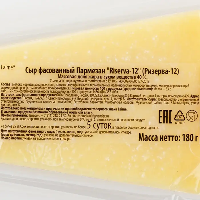 Сыр твердый Пармезан Ризерва-12 40% Laime, 180 гр
