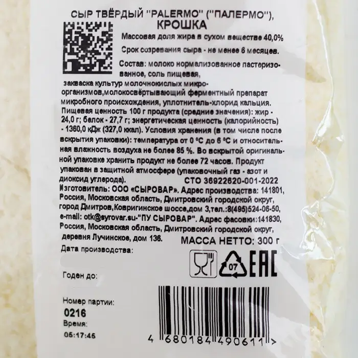 Сыр твердый Palermo 40% «Русское молоко», выдержка 6 месяцев, крошка, 300 г