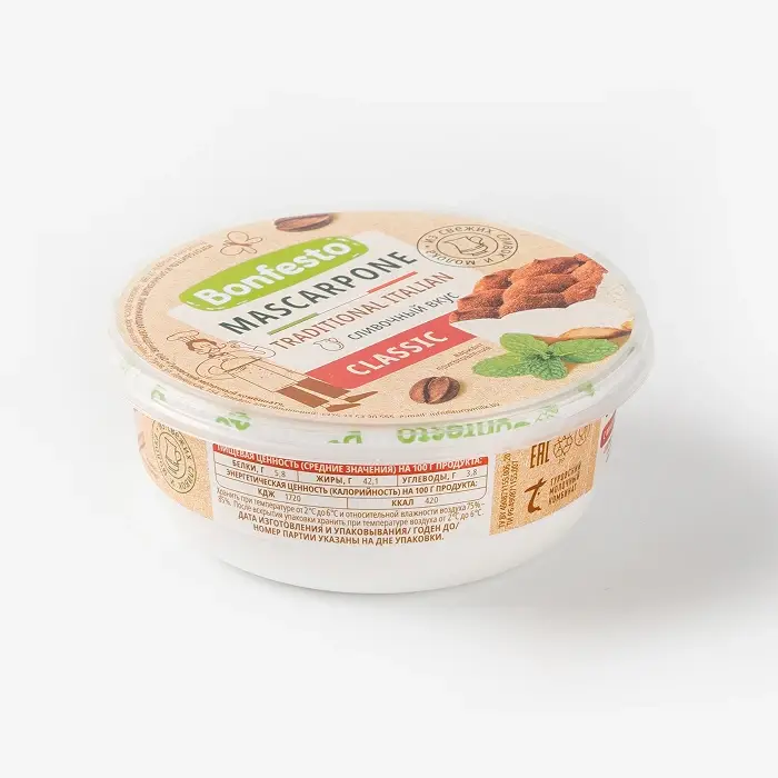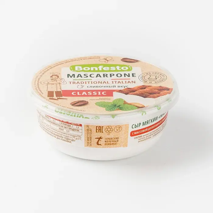Маскарпоне — традиционный итальянский сыр, его готовят из коровьих сливок. Маскарпоне имеет нежный сливочный вкус с легкой кислинкой, густую кремообразную текстуру. Упаковка защищает продукт от влаги, внешних воздействий и воздуха, что позволяет продлить срок его хранения.