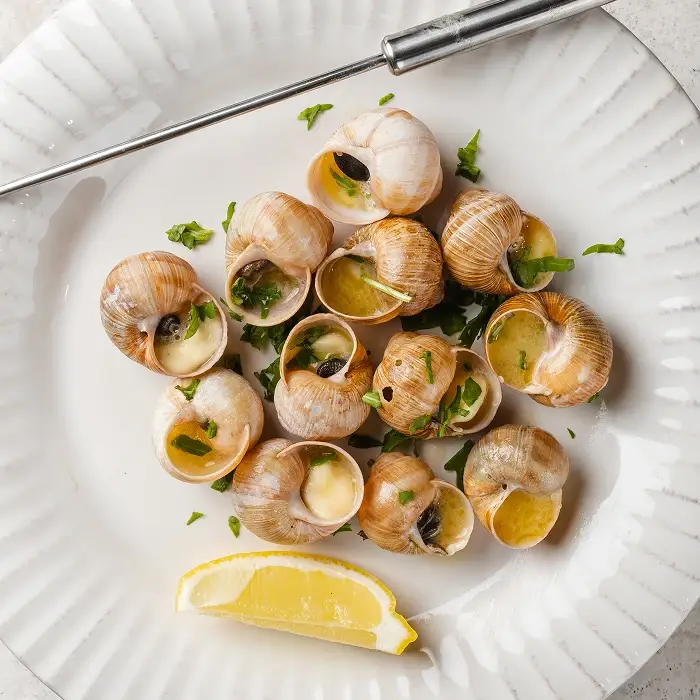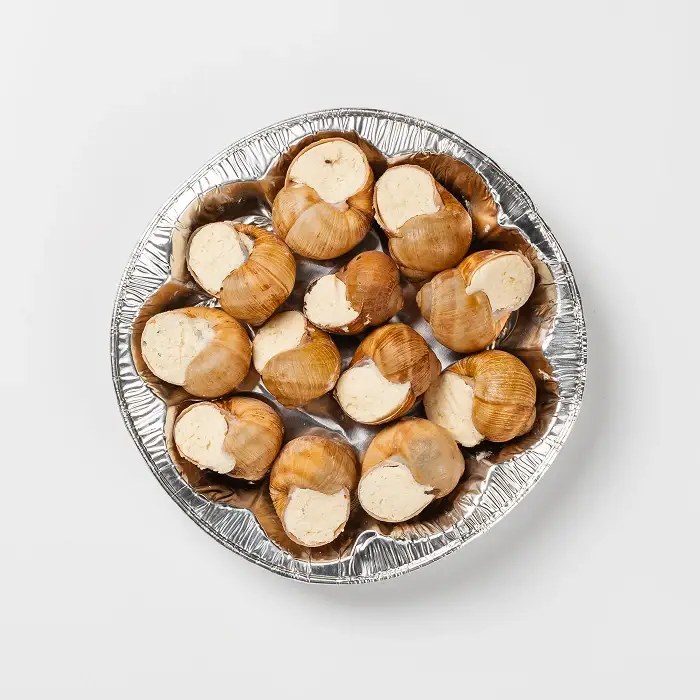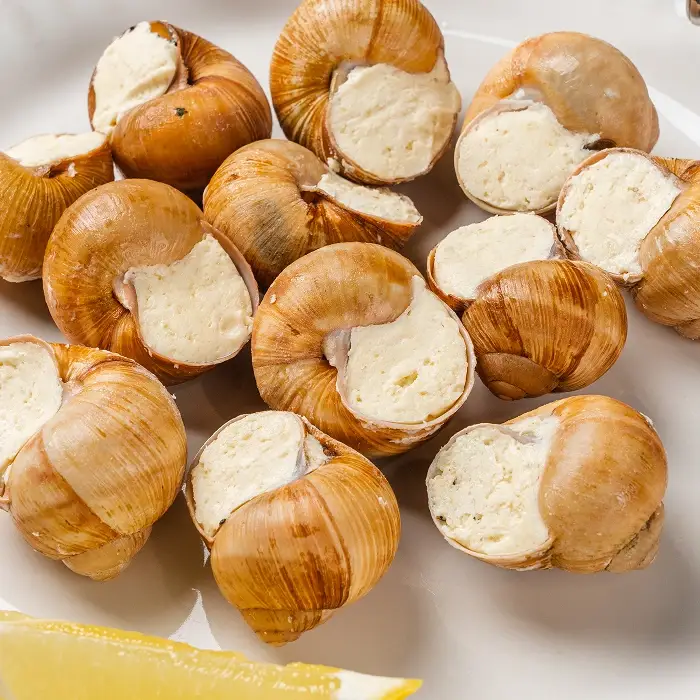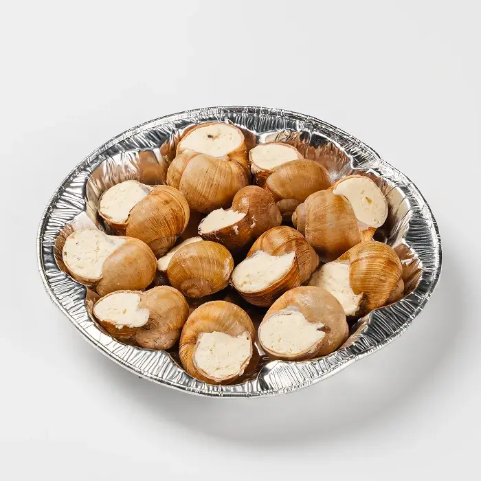 Улитки в собственных раковинах, очищенные и наполненные густым, кремообразным соусом светло-бежевого цвета, сливочного вкуса без излишней остроты или кислоты. Улитки имеют нежную, упругую и сочную текстуру.