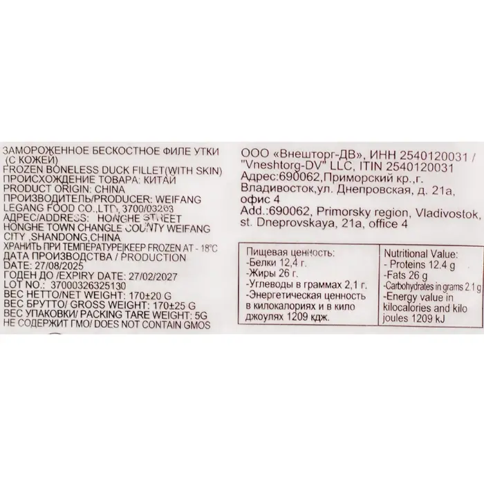 Утка, филе грудки на коже свежезамороженное "Внешторг-ДВ", 170 г