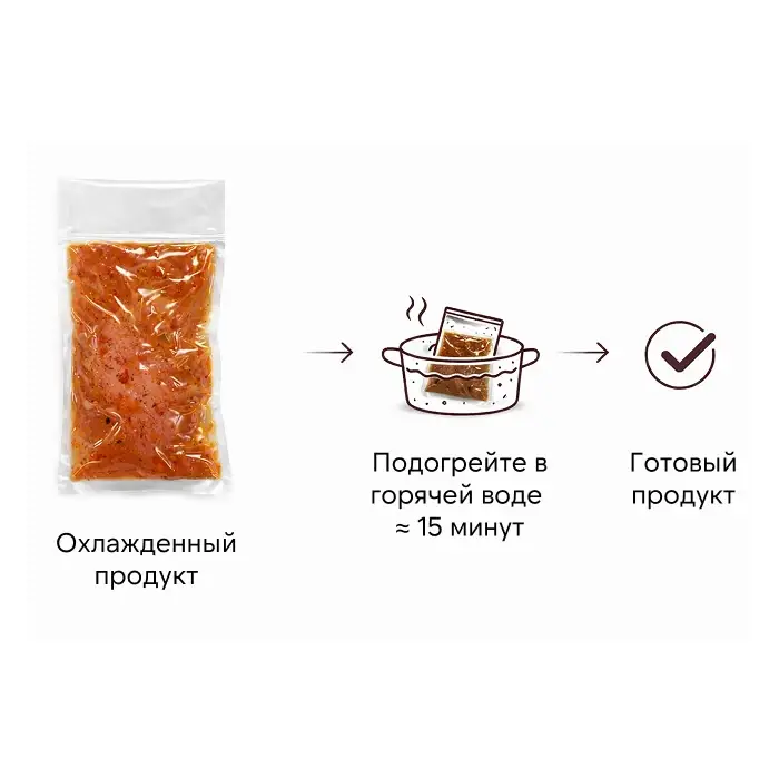 Погрузите продукт в вакуумной упаковке (сняв этикетку) в горячую воду (около +80 °C) в течение 10–15 минут. Затем после вскрытия продукт готов к употреблению.