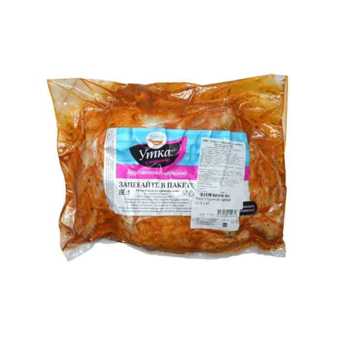 - продукт готов к запеканию;- можно запекать прямо в пакете, что предохранит ваш духовой шкаф от загрязнений и капель жира;- мягкое и сочное мясо утки без предварительной подготовки и длительного маринования