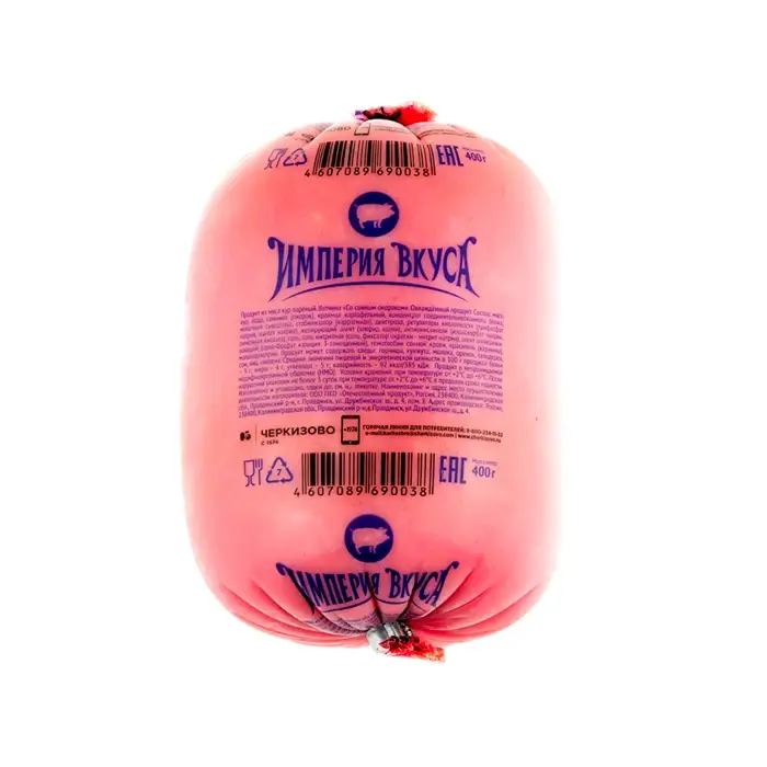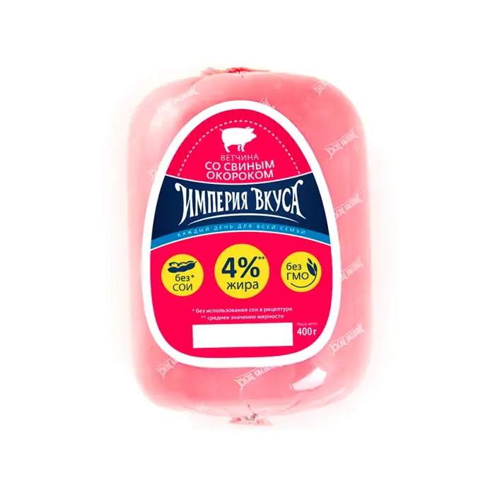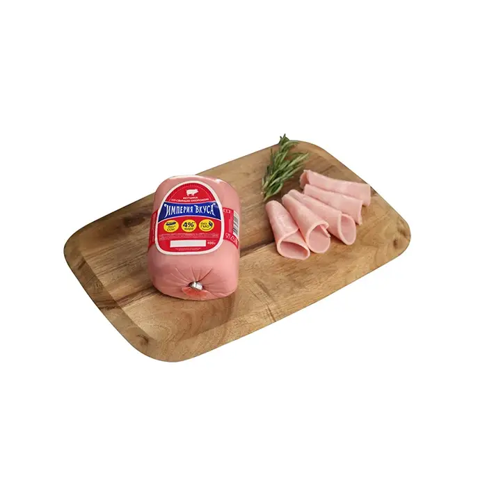 Ветчина со свиным окороком в форме цилиндра имеет в меру соленый, пикантный, мясной вкус, нежную текстуру, привлекательный внешний вид, розовый цвет.