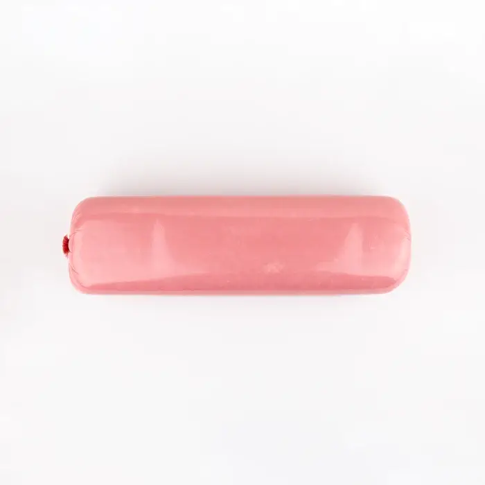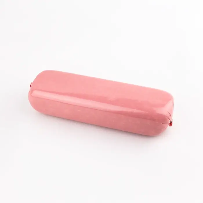 Ветчина со свиным окороком в форме цилиндра имеет в меру соленый, пикантный, мясной вкус, нежную текстуру, привлекательный внешний вид, розовый цвет.