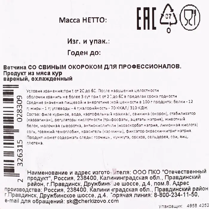 Мясо кур, вода, свинина окорок, крахмал картофельный, концентрат соединительного белка, молочная сыворотка, стабилизатор каррагинан,декстроза, регуляторы кислотности трифосфат натрия, ацетат натрия, ортофосфат калия 1-замещенный, агент желирующий хлорид калия,антиокислители изоаскорбат натрия, лимонная кислота, соль нитритная (соль, фиксатор окраски нитрит натрия), гемоглобин свиной,краситель кармин, мальтодекстрин.