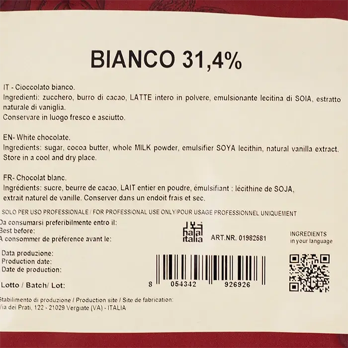 Белый шоколад с содержанием какао 31,4 %, изготовленный в Италии. Шоколад после темперирования имеет гладкую текстуру с глянцевым блеском, высокую текучесть, нежный сливочный вкус с выраженными карамельно-молочными нотами и сливочно-ванильный аромат.