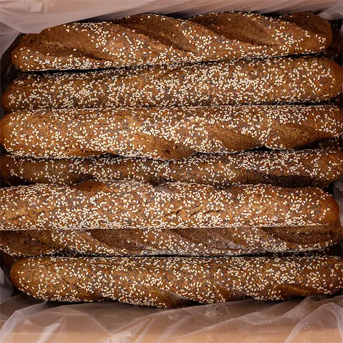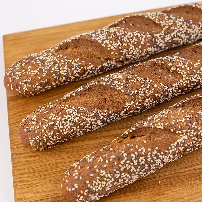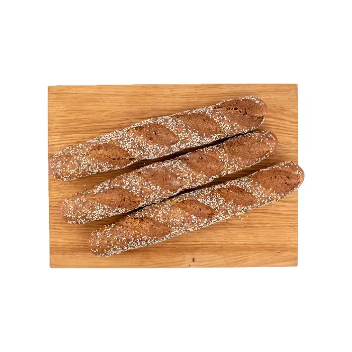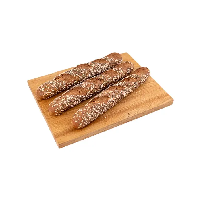 Багет из пшеничной муки высшего сорта с добавление ржаной. Багет подойдет к супам и горячим блюдам. Его не надо размораживать перед выпечкой. Просто выпекайте 6–8 минут при температуре 190–230°С . Багет хорошо реализуется в кейтеринговых компаниях, пекарнях, ресторанах или кафе, магазинах розничной торговлии в домашних условиях.