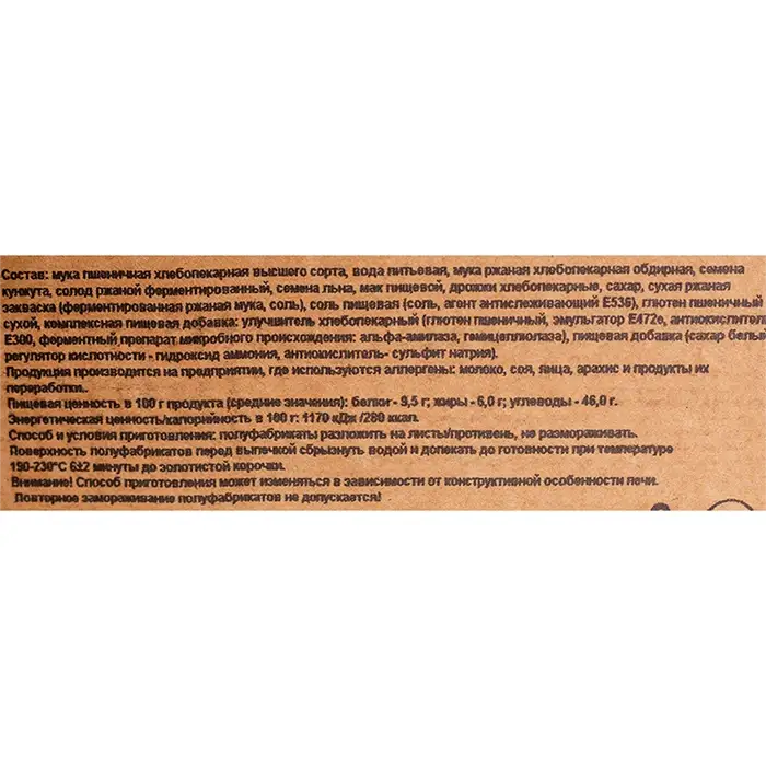 Мука пшеничная хлебопекарная высшего сорта, мука ржаная обдирная, вода питьевая, дрожжи хлебопекарные, смесь для хлеба, соль поваренная пищевая, улучшитель хлебопекарный (мука пшеничная, эмульгатор Е 481, ферменты, антиокислитель Е 300).