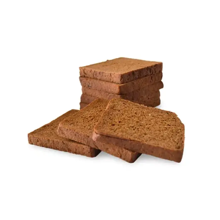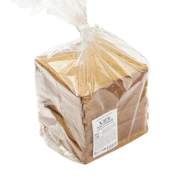 Замороженный темный ржаной хлеб имеет пористую текстуру и тонкую корочку, порезан на одинаковые ровные ломтики.
