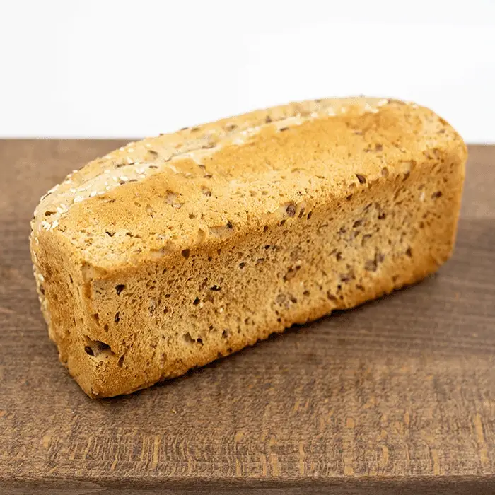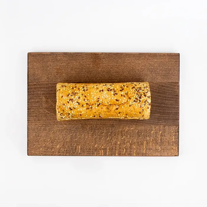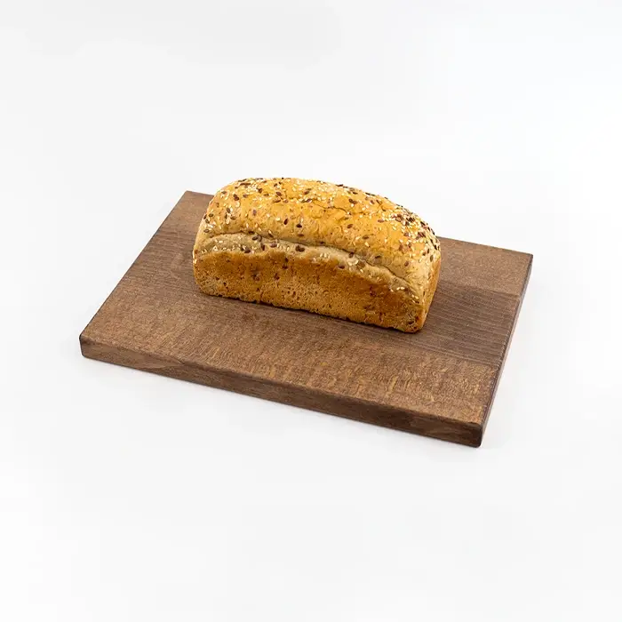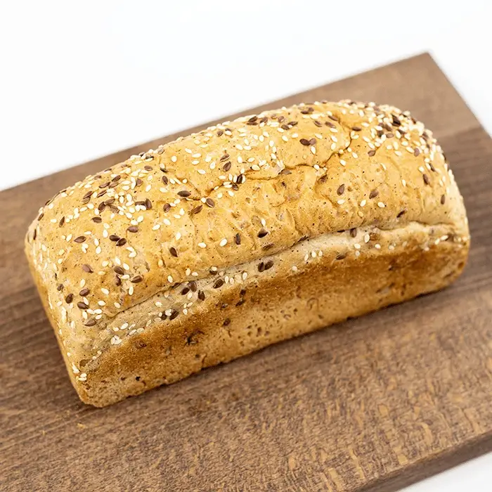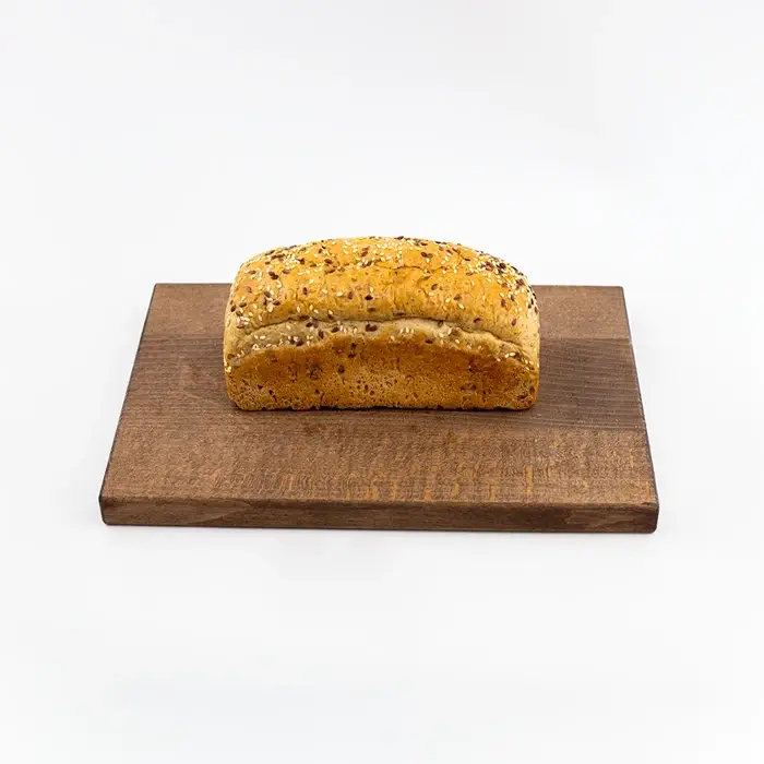 Хлеб имеет прямоугольную форму с равномерно пропеченной корочкой золотисто-коричневого цвета, насыщенный аромат свежеиспеченной выпечки и пшеничный вкус с маслянистыми и ореховыми нотами. На поверхности и внутри отчетливо видны вкрапления семян подсолнечника и льна. Мякиш равномерно пористый, без пустот и крупных разрывов.