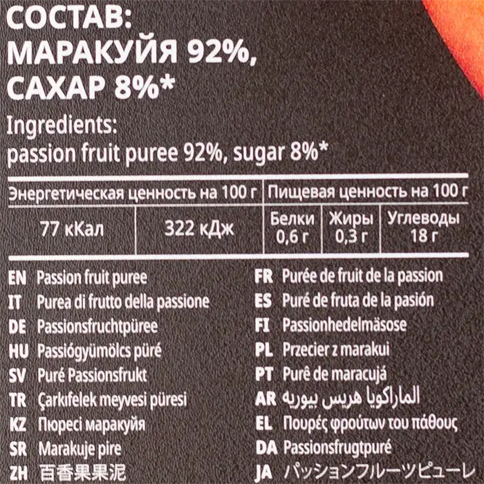 Пюре на основе свежевыжатого сока и мякоти спелых фиолетовых плодов, выращенных в провинции Вьетнама. Пюре маракуйи имеет жидкую однородную консистенцию, сочный кислый вкус с природной сладостью и тропический аромат с цветочными нотами. Не содержит ГМО, примесей и добавок.