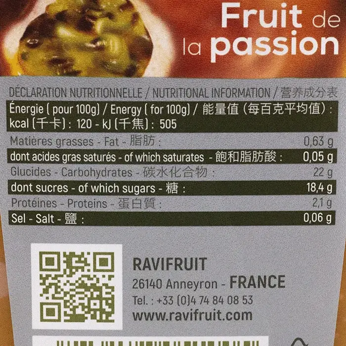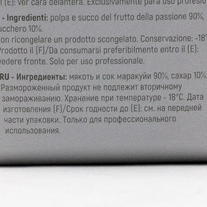 Пюре на основе мякоти спелых маракуй с добавлением сахара. Пюре имеет яркий оранжевый цвет, жидкую, однородную текстуру с косточками, сочный кислый вкус с природной сладостью и тропический аромат с цветочными нотами. Не содержит ГМО, примесей и добавок.