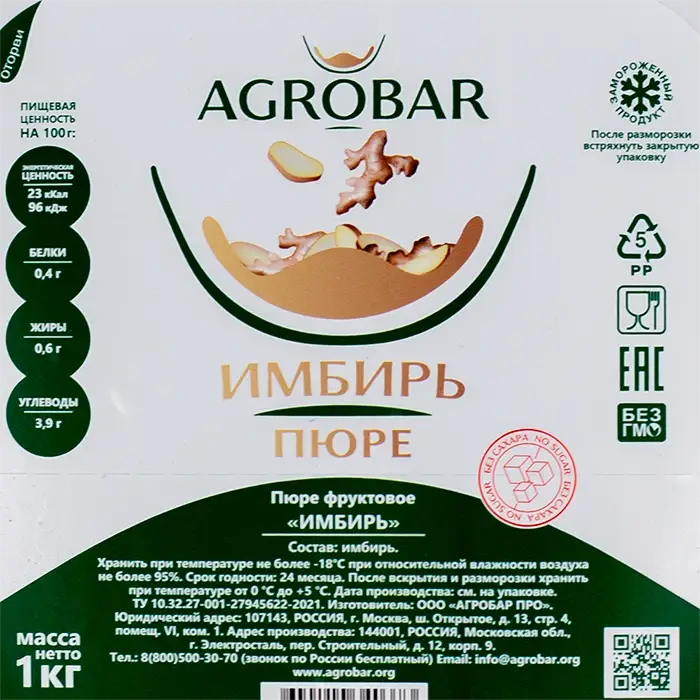 Пюре замороженное Имбирь без сахара AGROBAR, 1 кг