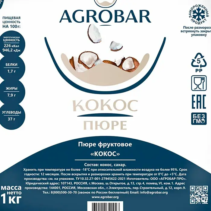 Пюре замороженное Кокос AGROBAR, 1 кг
