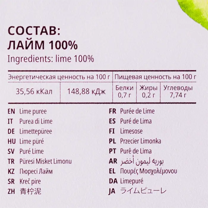 Пюре на основе свежевыжатого сока из спелых плодов, выращенных в Мексике. Лаймовое пюре имеет жидкую консистенцию, терпкий, кислый вкус и цитрусовый аромат. Не содержит сахара, ГМО, примесей и добавок.