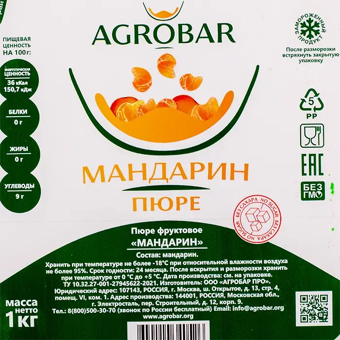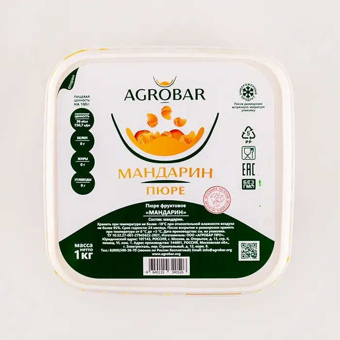 Пюре замороженное Мандарин без сахара AGROBAR, 1 кг