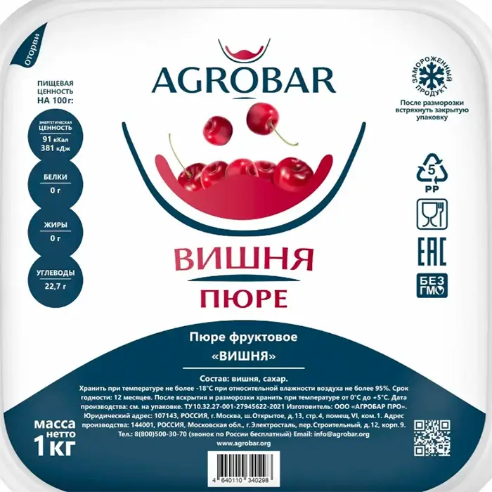 Пюре замороженное Вишня AGROBAR, 1 кг