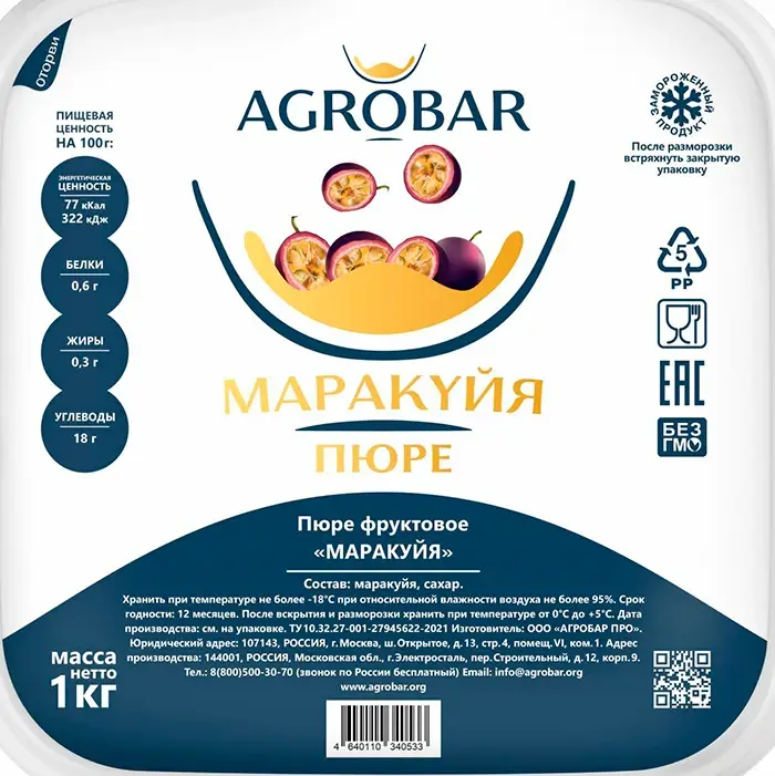 Замороженное пюре маракуйи представляет собой натуральный продукт, полученный путем измельчения мякоти спелых плодов маракуйи. Заморозка позволяет сохранить максимум полезных веществ и вкусовых качеств фрукта, обеспечивая длительное хранение и удобство использования.