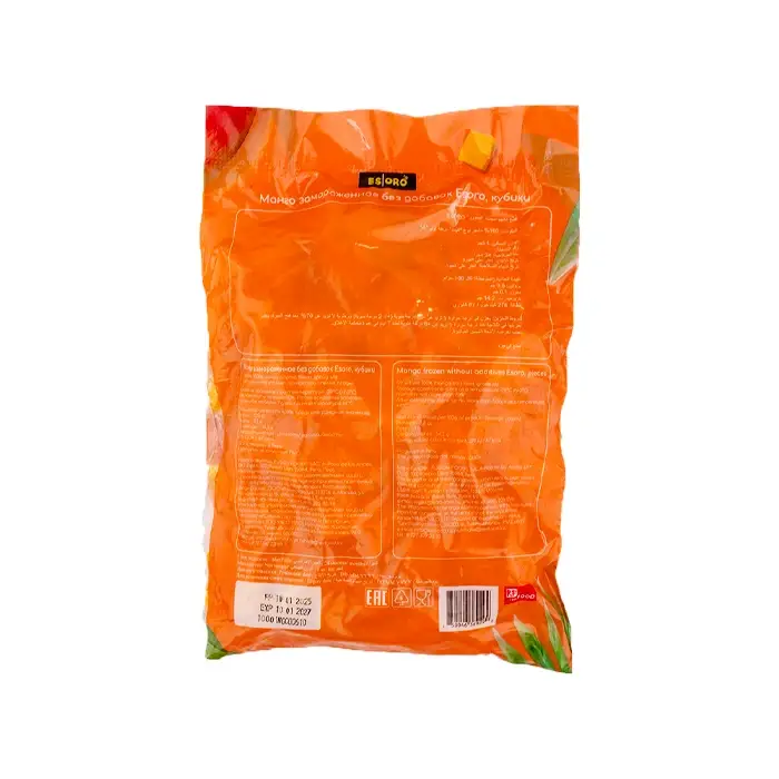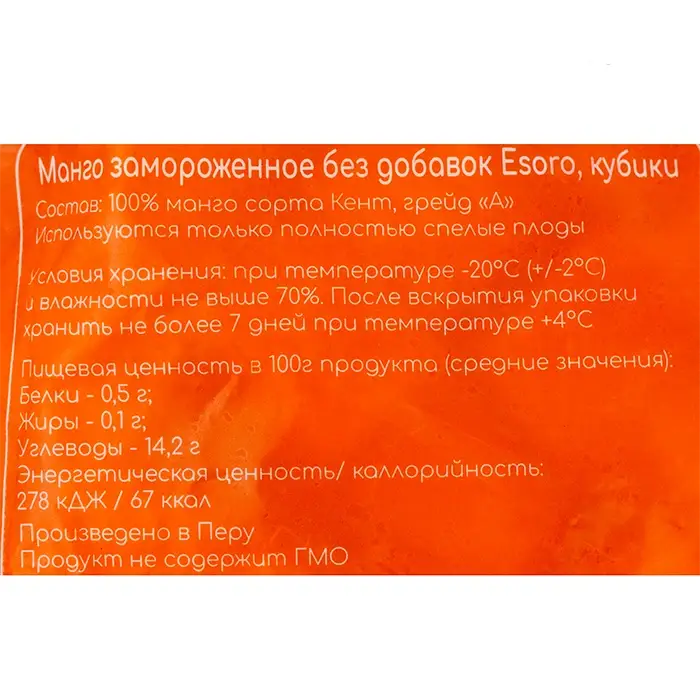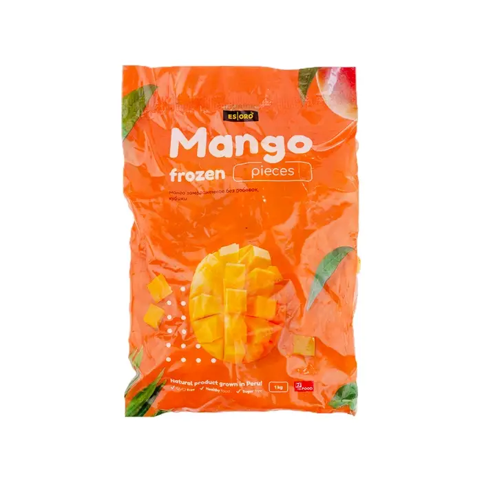 Манго Esoro собирается вручную и подвергается шоковой заморозке по технологии IQF — сохраняет свой первоначальный вкус, цвет и аромат. Фрукт не нуждается в чистке и обработке: он уже нарезан кусочками.