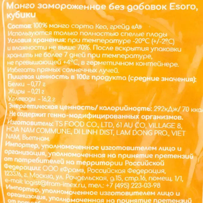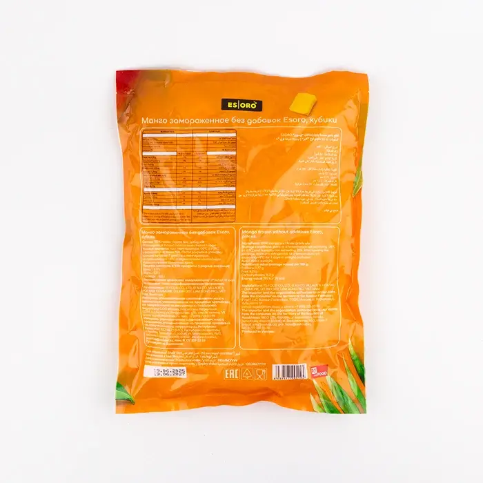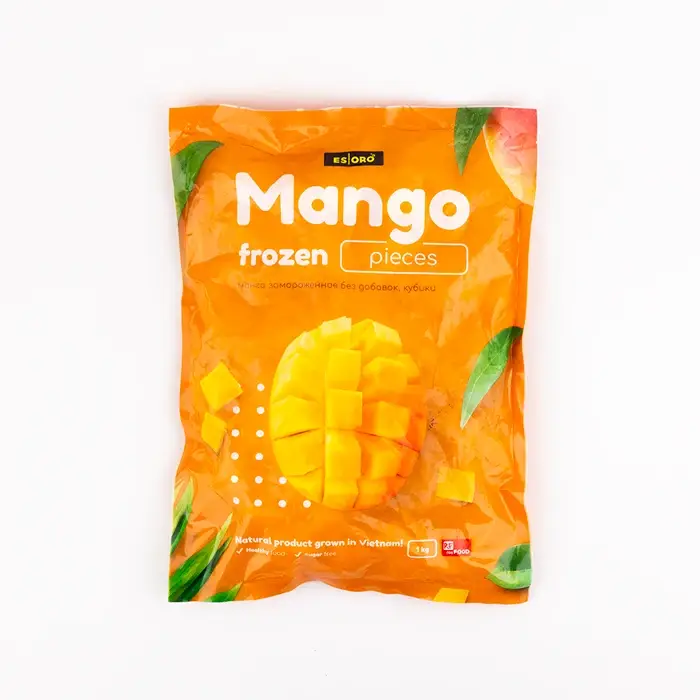 Манго Esoro собирается вручную и подвергается шоковой заморозке по технологии IQF — сохраняет свой первоначальный вкус, цвет и аромат. Фрукт не нуждается в чистке и обработке: он уже нарезан кусочками.