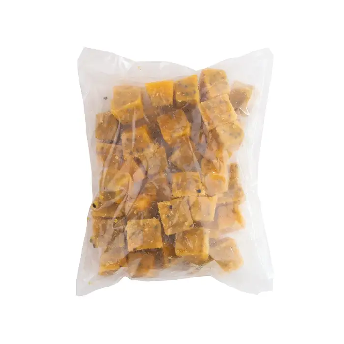 Маракуйя с приятным, сладковатым и немного терпким тропическим вкусом удобно нарезана на кубики.