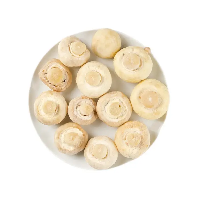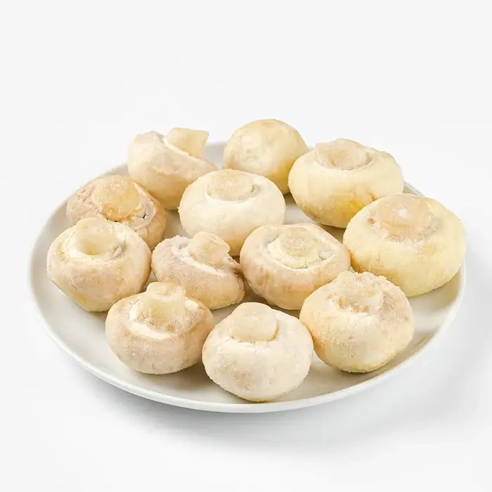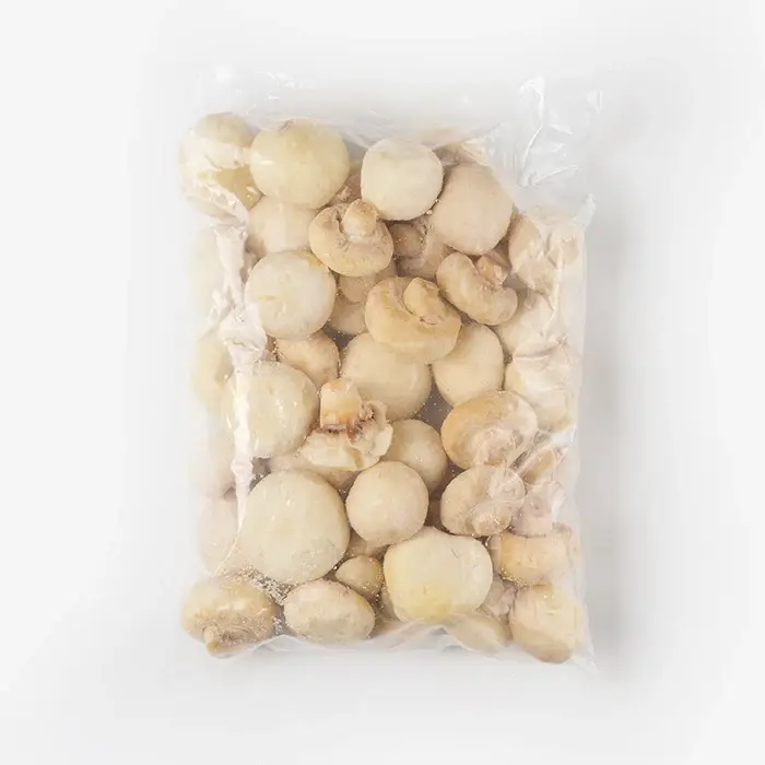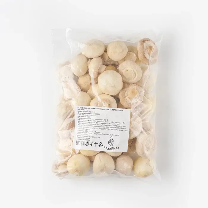 Целые шампиньоны с плотной шляпкой белого или бежевого цвета шоковой заморозки.