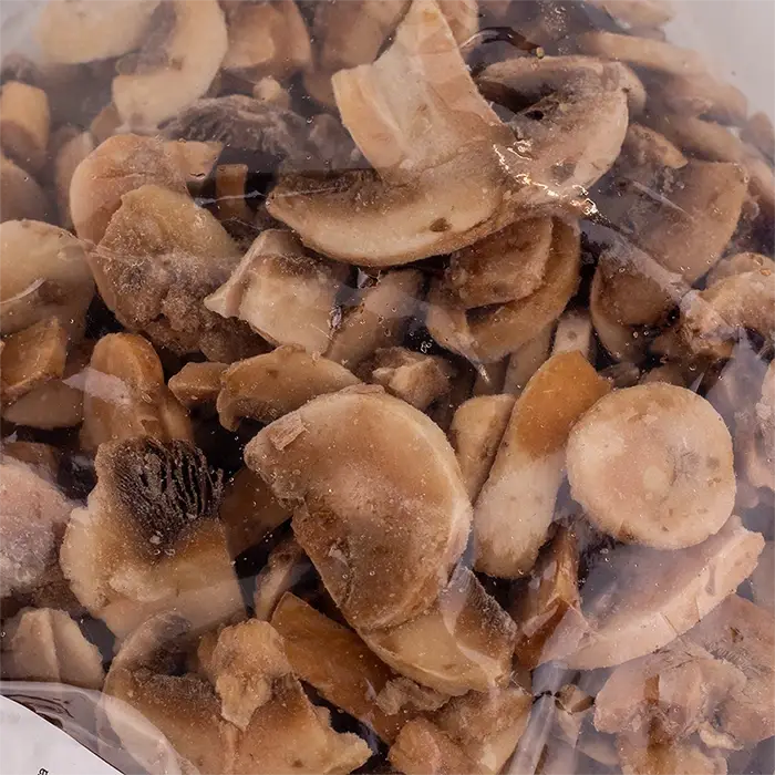 Шампиньоны нарезаны слайсами, имеют белый цвет, плотную мясистую структуру и грибной вкус с легкими земляными нотами.