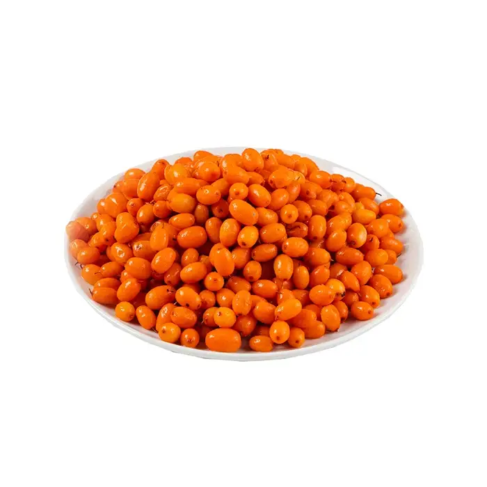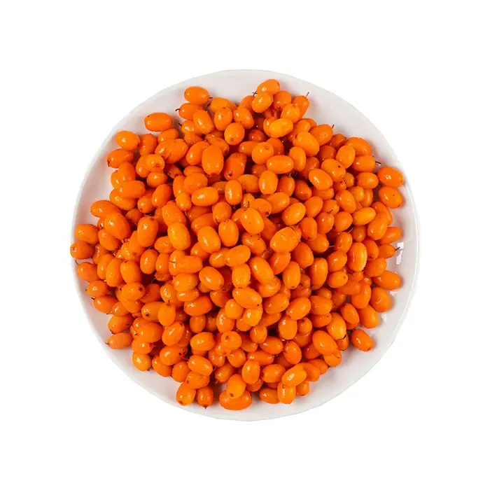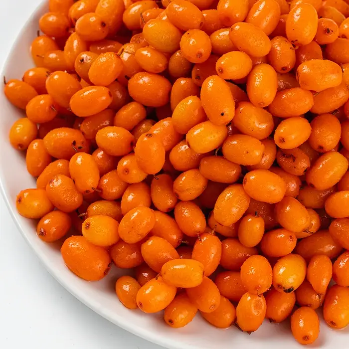 Цельные ягоды облепихи имеют ярко-оранжевый цвет, маленький размер, сочную мякоть и гладкую плотную кожицу, яркий кисло-сладкий вкус с легкой горчинкой в послевкусии и терпкий аромат с тропическими нотами.