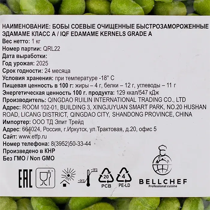 Бобы зеленые соевые очищенные свежемороженные Эдамаме Bellсhef, 1 кг