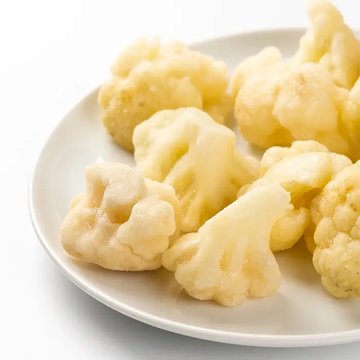 Цветная капуста белого цвета имеет нежную, слегка хрустящую консистенцию, сливочно-ореховый вкус со сладковатыми нотами и свежий растительный аромат. Соцветия не развариваются в кашу.