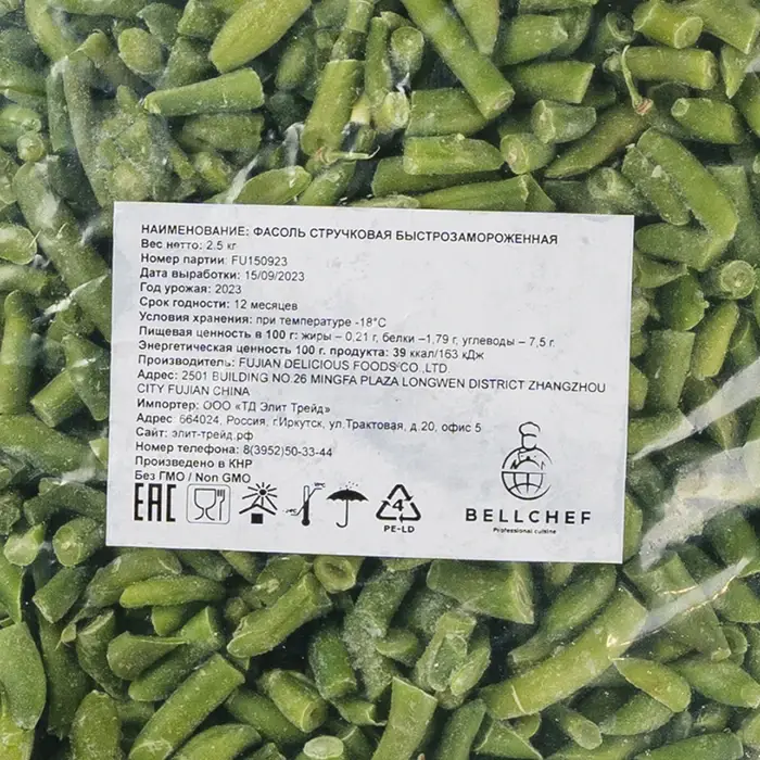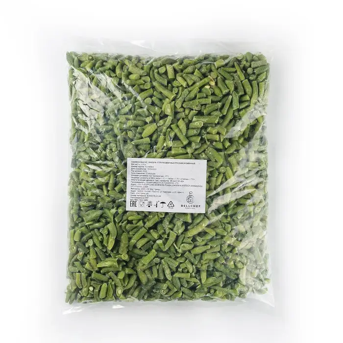 Молодая стручковая фасоль, нарезанная на кусочки длиной 3–4 см. Фасоль имеет зеленый цвет, вытянутую форму, упругую и слегка хрустящую текстуру, травянистый вкус со слегка сладковатыми нотами и свежий аромат.