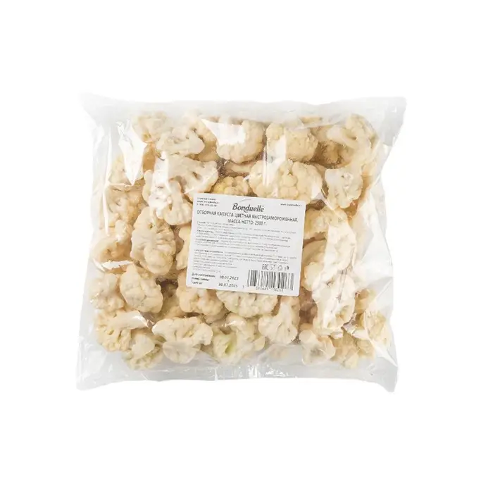 Хрустящая нежная цветная капуста молочного цвета имеет мягкий ореховый вкус со сладкими оттенками. Капуста остается упругой после термической обработки, не требует длительной готовки и размораживания.